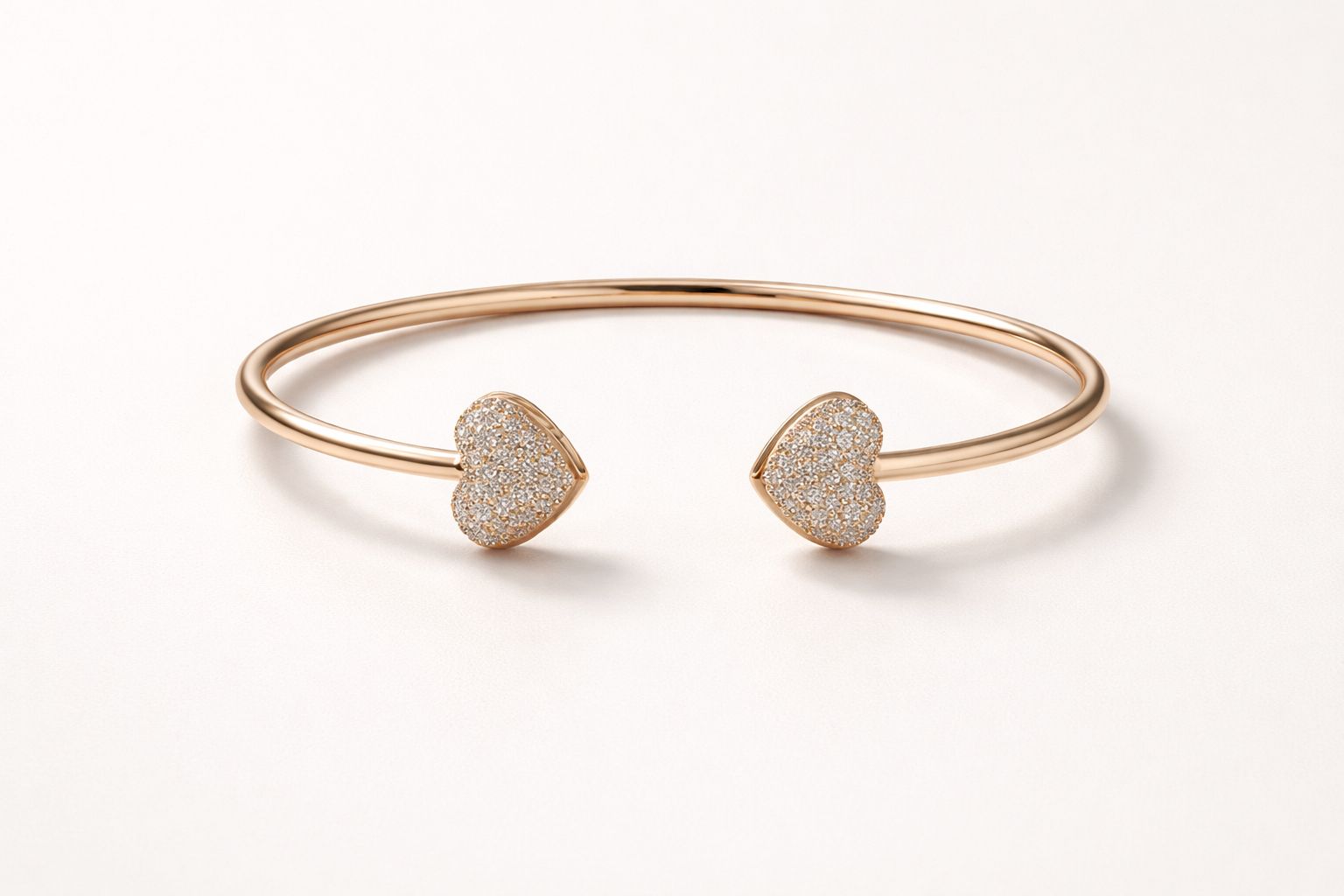Delicado, sofisticado e carregado de significado, este bracelete é uma semijoia desenvolvida com acabamento impecável e banho em ouro rosé de alta qualidade. Seu design aberto traz dois corações cravejados em pavê de microzircônias, que captam a luz com um brilho sutil e apaixonante.