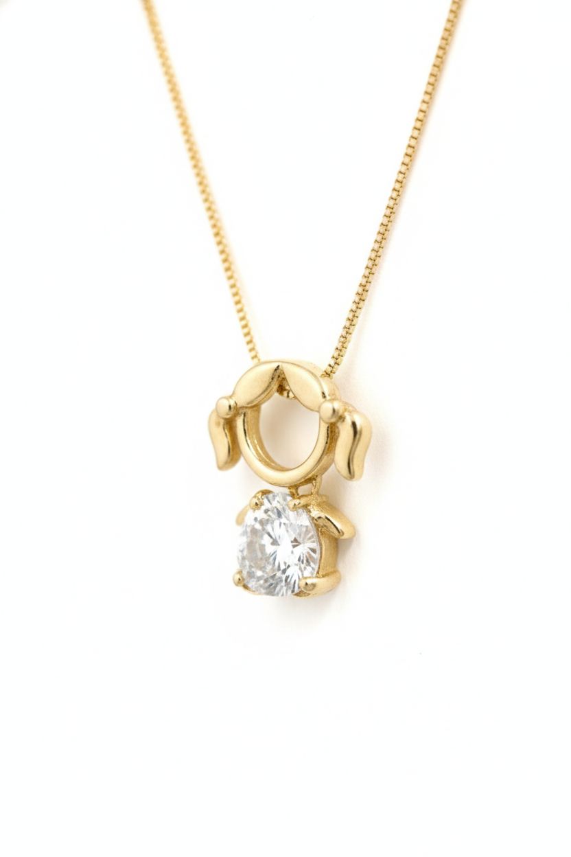 O pingente possui um formato delicado de Menina com acabamento dourado premium, valorizado por uma zircônia cristal de alto brilho, cuidadosamente lapidada para refletir a luz e destacar ainda mais a sofisticação da peça.